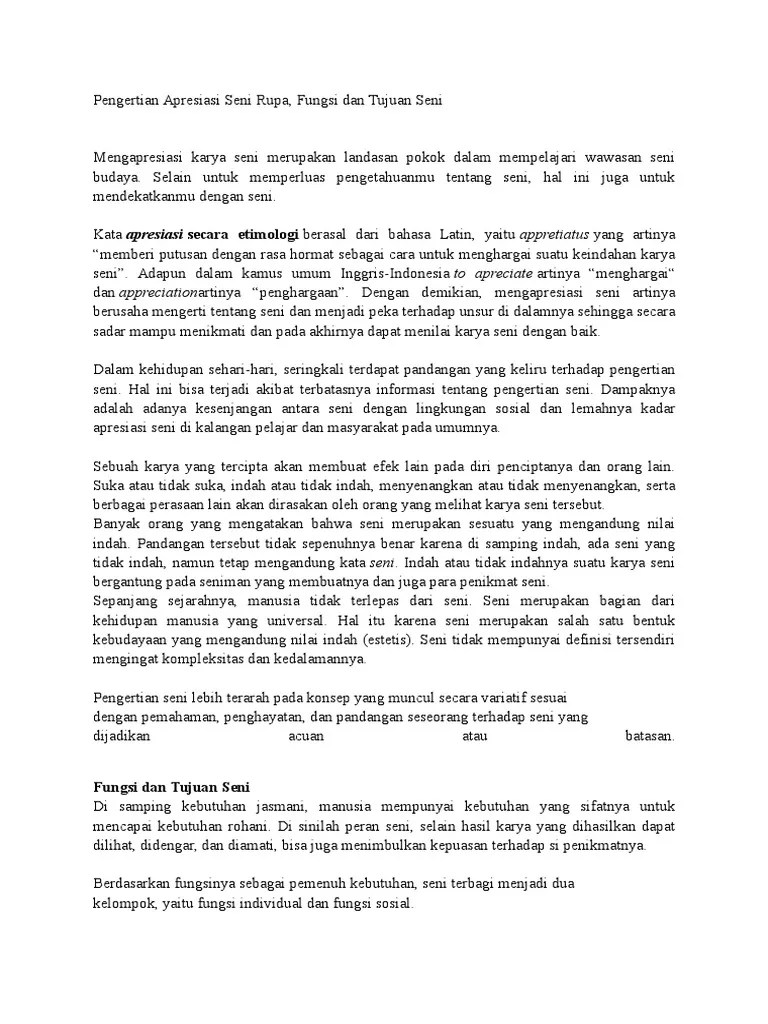 Meningkatkan dan memupuk kecintaan kepada karya bangsa sendiri dan sekaligus kecintaan kepada . Apresiasi karya seni 2d adalah menilai suatu karya seni dua dimensi berupa lukisan, gambar, dan sebagainya berupa ringkasan positif dan . Suatu proses melihat, mendengar, menghayati, menilai, menjiwai,. Jelaskan ragam bentuk kesenian nusantara! Ada dua fungsi kegiatan apresiasi seni, yaitu: